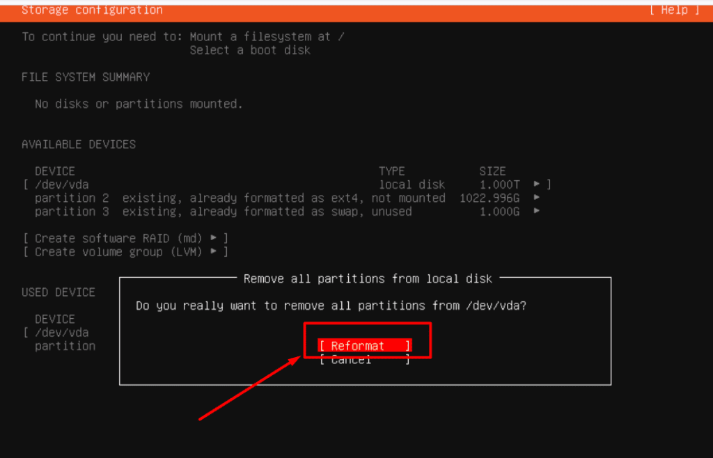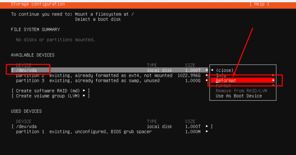 /dev/vda), then choose “Reformat” from the submenu and confirm.