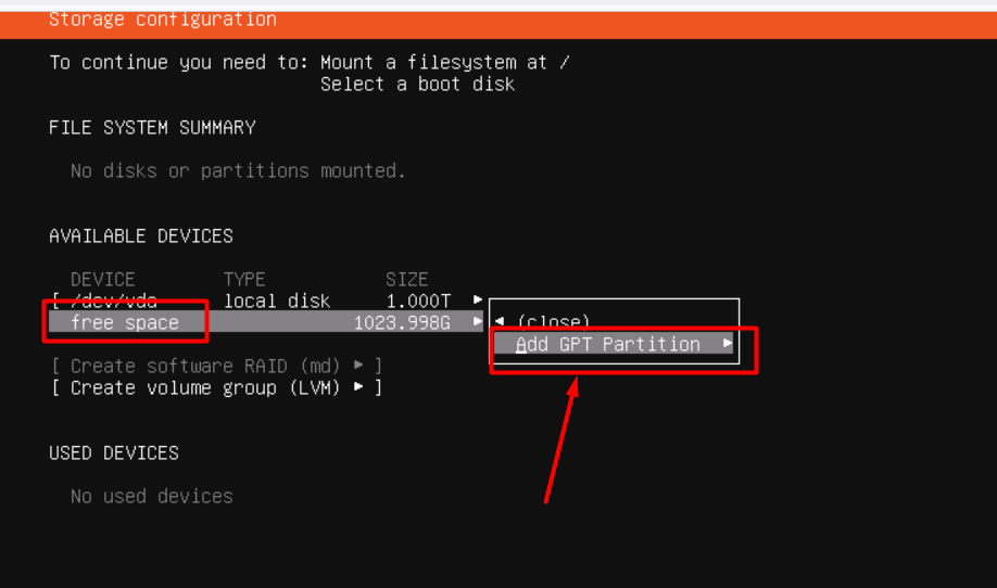 - Partitioning: You should now see the disk as free space. Select “Add GPT Partition” for