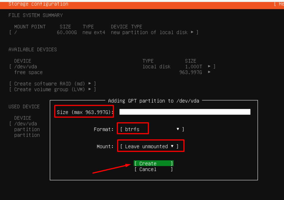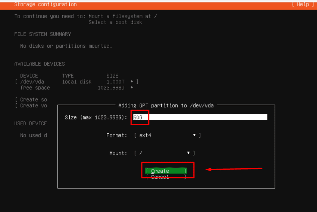 /, choosing a size of 60GB to ensure adequate room. Enter60G, select Create, and press Enter.