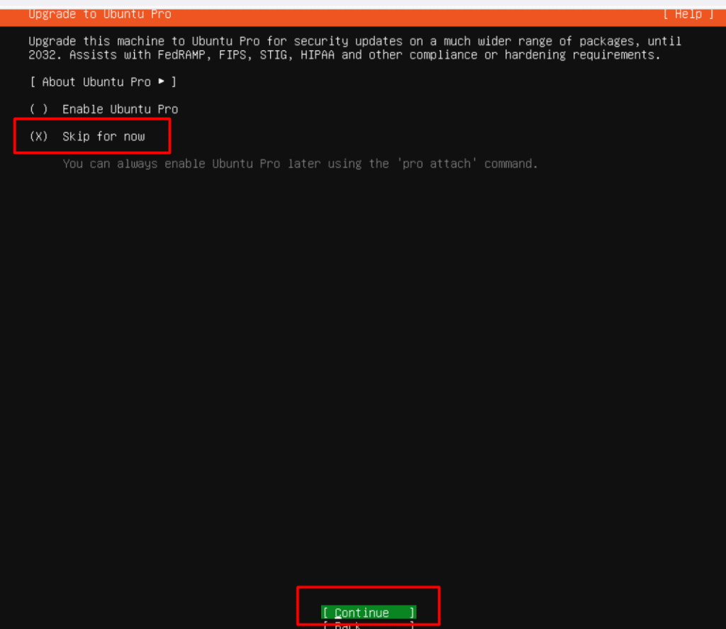 - Skip Ubuntu Pro: Choose “Skip for now” on the “Upgrade to Ubuntu Pro” page.