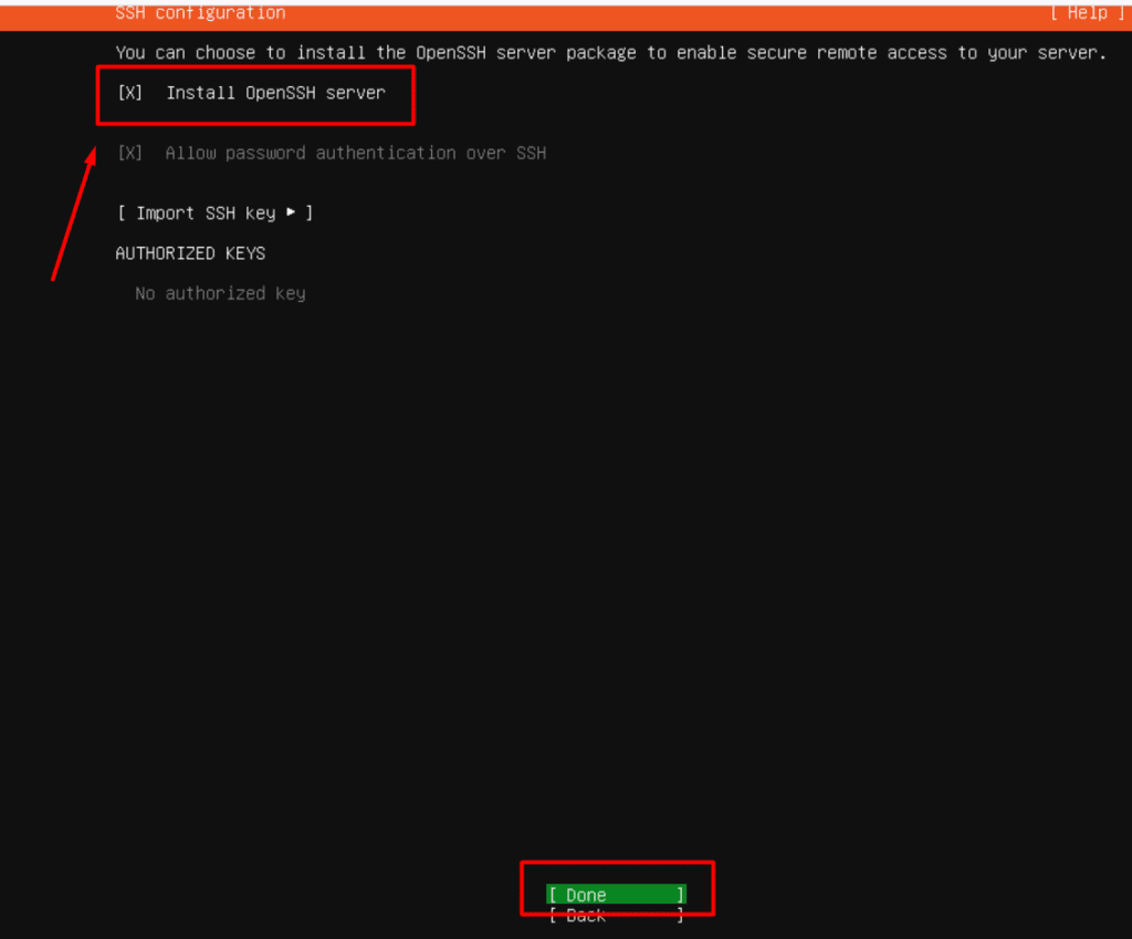 - SSH Configuration: Select “Install OpenSSH Server” to enable SSH.