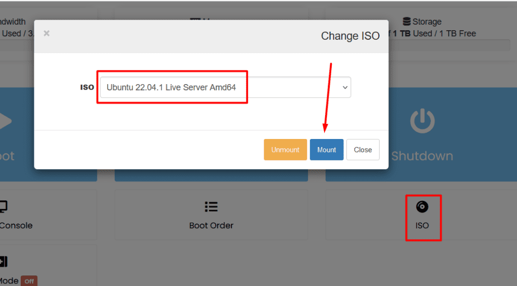 bkpsrv1.yourdomain.com). You can grab the ips in the AlphaVPS client area by navigating to Product Details > Server Information > Edit Hostname. - Mount the ISO: In your client area, go to Server Information > ISO. Choose “Ubuntu 22.04.1 Live Server Amd64” (Yes, unfortunately, version 24 is not currently available) and click Mount. (You might not receive a success message; it’s likely mounted.)