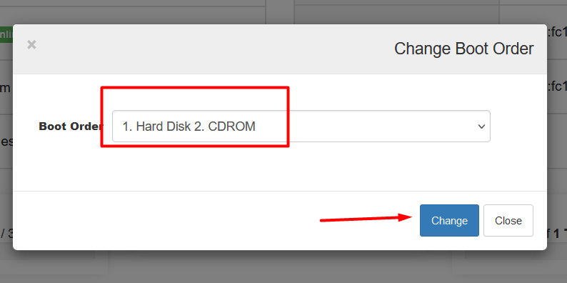- Set Boot Order: Change the boot order to “1. Hard Disk 2. CDROM,” then reboot.