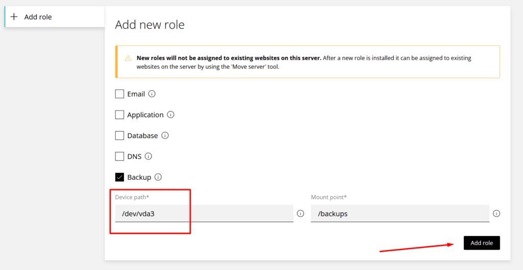 Your VPS is now ready to handle backups for your Enhance cluster. Basically , You just need to click Add role and check the Backup box. Fill out the form as needed and hit Add role.