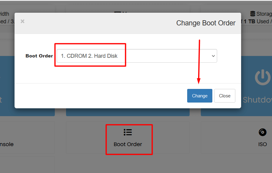 - Set Boot Order: Go to Boot Order, select “1. CDROM 2. Hard Disk,” and save the changes.