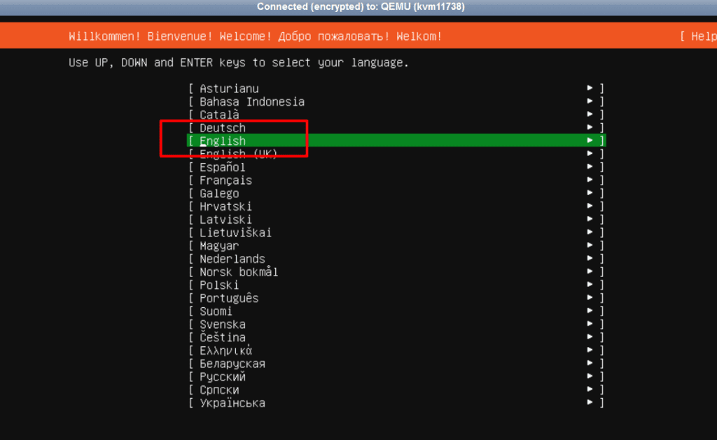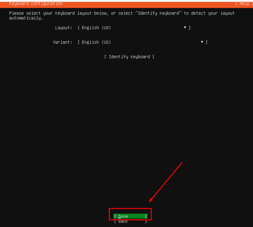 - Language Selection: When Ubuntu Live Server starts, confirm English by pressing Enter.