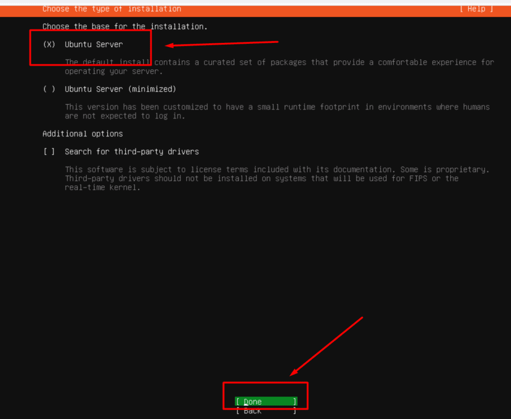 - Installation Base: Select “Ubuntu Server” and press Enter.