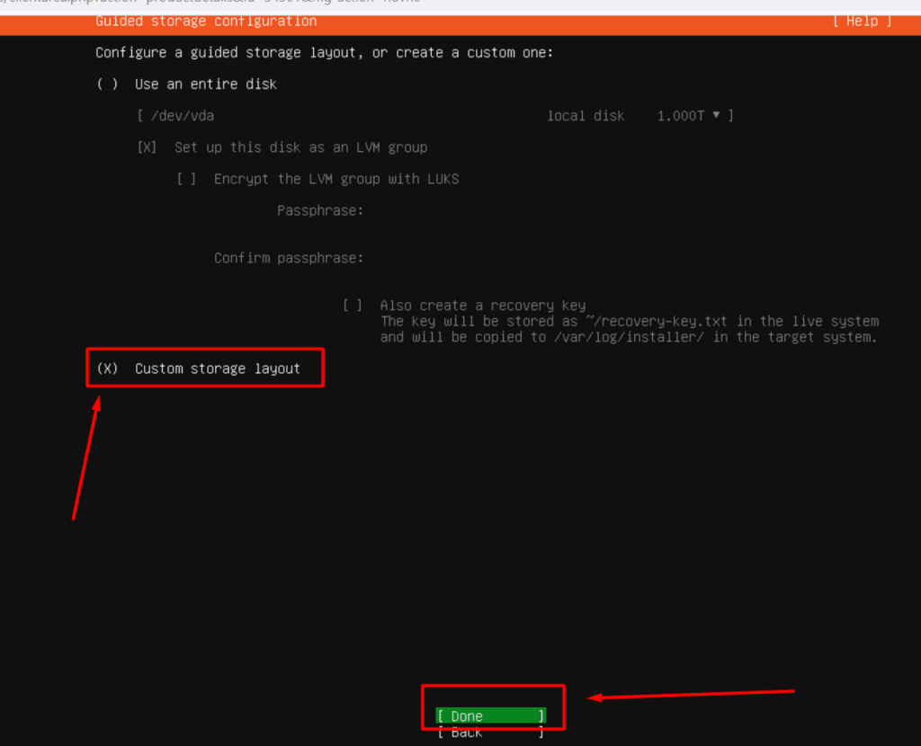 - Storage Layout: On the “Guided Storage Configuration” page, choose “Custom Storage layout” by navigating with the down arrow and selecting it with the spacebar.