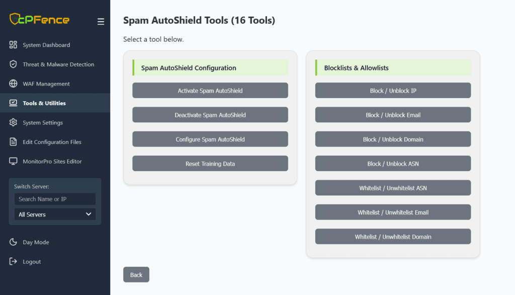 And that’s just the beginning—Spam AutoShield gives you the tools to take full control of spam filtering across your entire server, with precision and ease. Let’s break them down.
